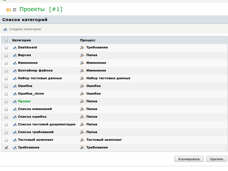 Для того, чтобы удалить категорию, перейдите через меню к списку категорий, отметьте нужную категорию и нажмите кнопку "Удалить".