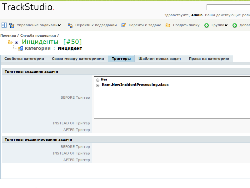 Через категории вы можете привязать триггеры, которые будут выполняться при создании или редактировании задачи. Триггеры могут быть трех типов: одни выполняются до основных действий (непосредственно перед созданием задачи), вторые — вместо основного действия и третьи — после выполнения действия. На одно действие, таким образом, вы можете назначить не более трех триггеров. Подробно о создании триггеров рассказано в соответствующем разделе документации.
