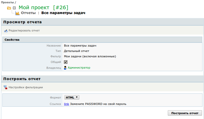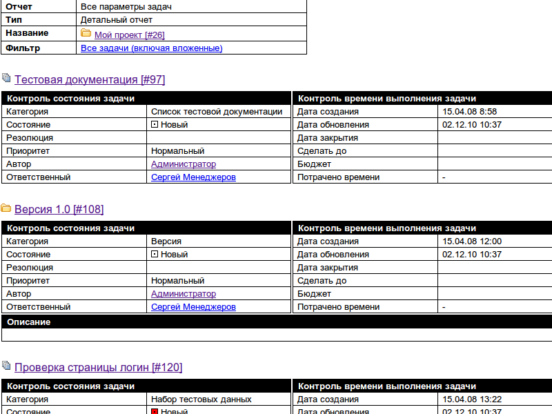 В детальном отчете для задач выводятся значения всех видимых полей. Фильтр при этом используется лишь для отсеивания ненужных задач. Отчет представляет собой таблицу с параметрами задач. Вы можете построить этот отчет в форматах HTML, PDF, Excel и Word
