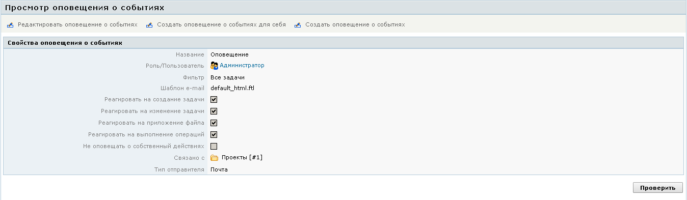 Для проверки оповещений используется кнопка "Проверить", которая находится на странице просмотра оповещения. Здесь нужно учитывать, что тестовое оповещение будет отправлено, если задача, в которой создано оповещение, попадает в фильтр, выбранный в оповещении.