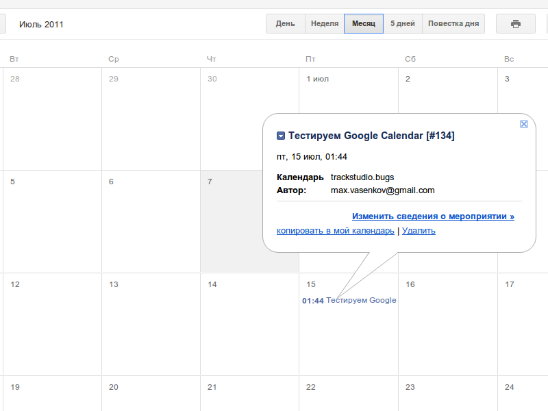 Если интеграция включена и правильно настроена, при создании новой задачи в Google Calendar появится событие с названием, соответствующим названию задачи, и описанием, соответствующим ее описанию. Автором задачи будет пользователь, через учетную запись Google которого осуществляется интеграция.