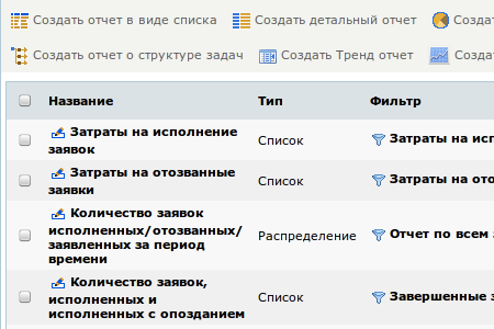 Все отчеты используют фильтры для выборки нужных задач. Всего в системе реализовано 8 типов отчетов: Список, Детальный, Распределение, Отчет о затраченном времени, Структура проекта, Тренд, Диаграмма Ганта и Табель. Данные отчетов можно выгрузить в форматах PDF, XML, CSV и MS Project.