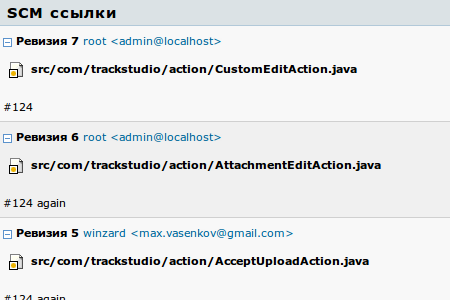 TrackStudio поддерживает интеграцию с несколькими системами контроля версий, такими как Subversion, CVS, Bazaar, Perforce, Git и Mercurial. Вы можете использовать несколько хранилищ в разных SCM для разных проектов. Из TrackStudio вы сможете просматривать коммиты в хранилище, привязанные к вашим задачам.