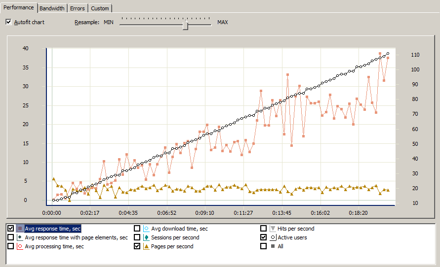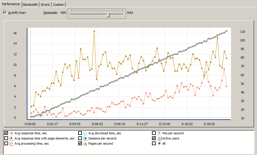 Для записи сценария тестирования мы решили использовать Softlogica WAPT 8.0, который был запущен на тестируемом сервере. Сценарий выполняется в течение 20 минут и включает в себя следующие профили пользователей, которые выполняются одновременно: