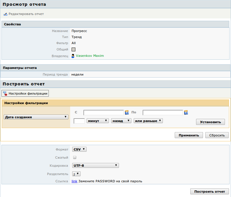 После создания отчета откроется страница с его свойствами. На ней можно указать формат вывода отчета (CSV или XML), кодировку символов, разделитель для CSV.