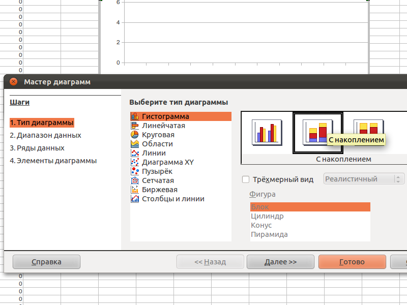 В Calc через меню ВставкаДиаграмма выбирайте Гистограмму с накоплением