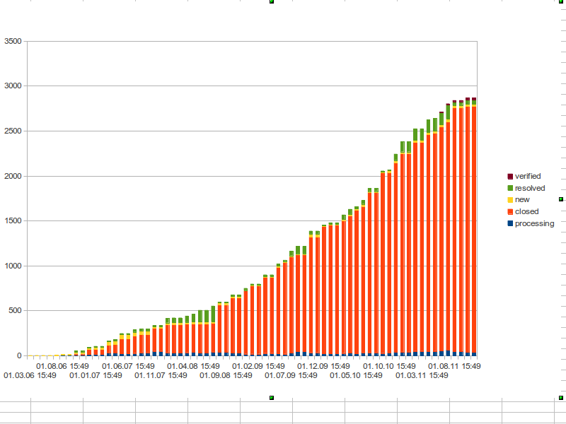 Отчет типа Тренд позволяет оценить количество новых, открытых, закрытых задач в каждый отчетный период. В отчете подсчитывается количество операций различных типов за период времени. Это может быть полезно, например, для определения готовности продукта к релизу. Данный отчет можно построить в пяти разных масштабах времени: годы, месяцы, дни, недели и часы. Отчет строится в форматах XML или CSV.