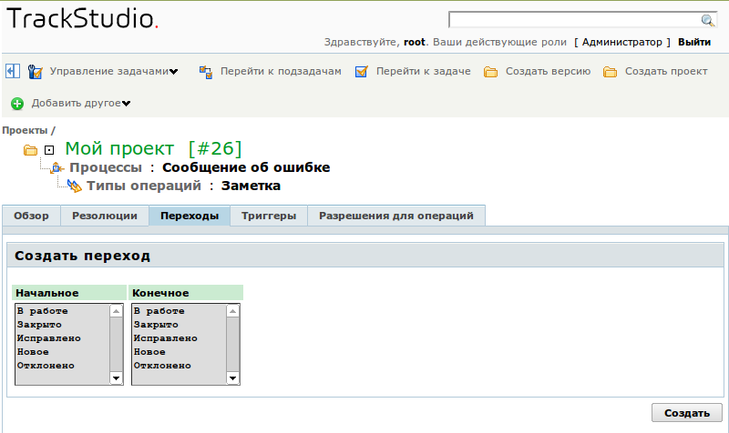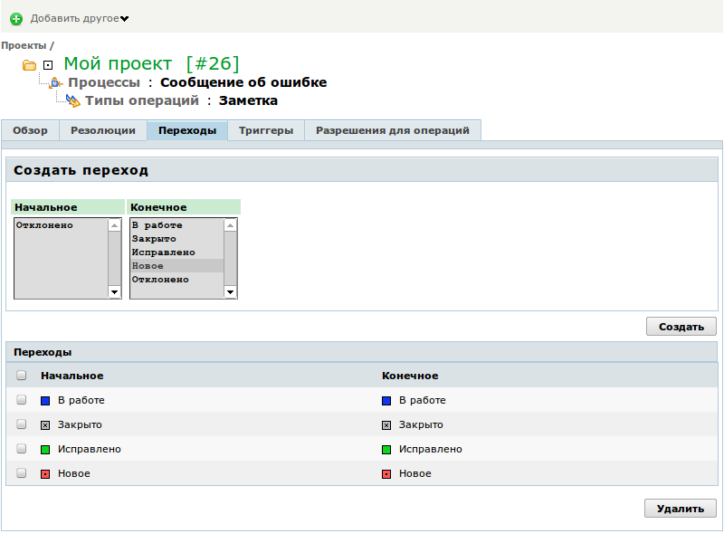 На открывшейся странице вы увидите два столбца с состояниями. В левом столбце — начальное состояние перехода, в правом — конечное. Одна операция может переводить задачу из разных состояний в разные, из разных в одно, но не из одного состояния — в разные.