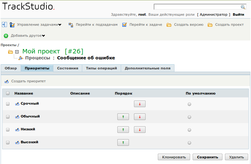 Приоритет в задаче указывает на ее важность и определяет порядок обработки задач для пользователей. Набор приоритетов выводится пользователю в виде выпадающего списка при создании, редактировании задач, а также при выполнении операций. Каждому приоритету соответствует название и вес, выраженный простым числом. Этот вес учитывается при сортировке задач в списках. Чем больше число, тем выше приоритет.