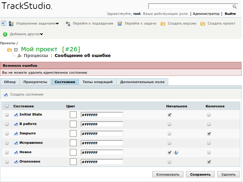 Для того, чтобы удалить состояние, отметьте его флажком в списке и нажмите кнопку "Удалить" внизу формы. Если вы пытаетесь удалить основное начальное состояние, то получите сообщение об ошибке: