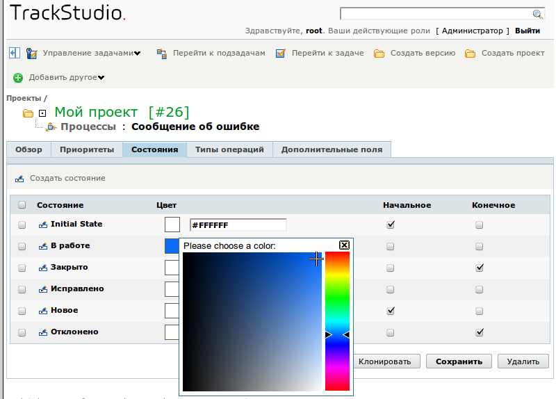 Вы можете редактировать параметры состояний прямо в списке: менять начальные и конечные состояния, менять их цвет. Для того, чтобы сменить цвет, кликните по квадрату в клонке Цвет и выберите нужный из цветовой палитры, либо задайте код цвета в соответствующем поле.