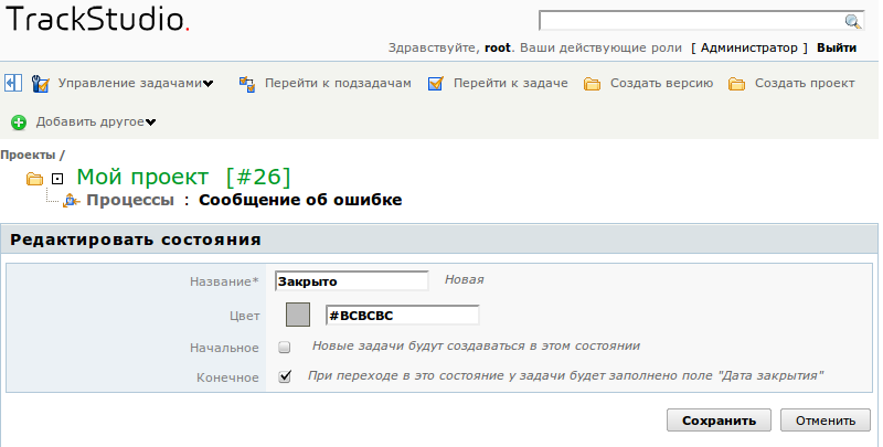 В одном из начальных состояний — задача будет находиться непосредственно после создания. До четвертой версии в TrackStudio можно было указать лишь одно начальное состояние. Затем, учитывая пожелания пользователей, мы сделали возможность выбора: если для процесса указано несколько начальных состояний, на форме создания задачи будет отображено поле со списком состояний. Это может быть полезно, если у задачи с таким процессом есть предыстория вне системы, или если при поступлении из различных источников она должна проходить разную обработку (можно сделать подтверждение заявки, полученной по электронной почте, например). Таким образом вы можете сделать несколько цепочек обработки задачи.