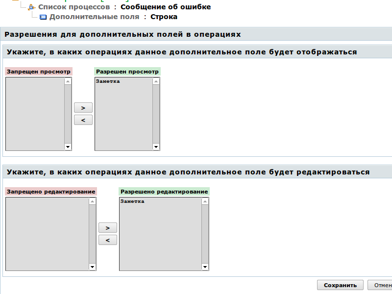 Настройки каждого из правил представлены в виде пар списков операций. В операциях из левого списка не могут видеть или редактировать значение дополнительного поля, в операциях из правого — могут.
