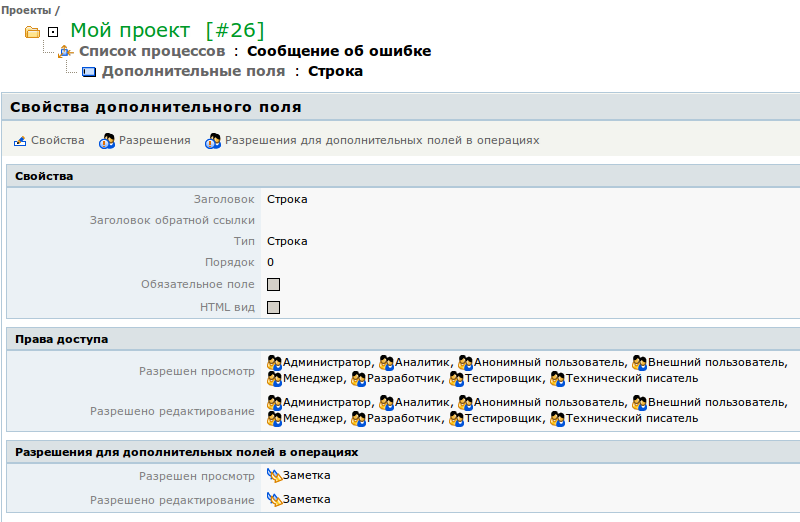 Для того, чтобы настроить разрешения для дополнительных полей, привязанных к процессу, перейдите к вкладке "Дополнительные поля" нужного процесса. Затем выберите в списке нужное поле и перейдите на его страницу.