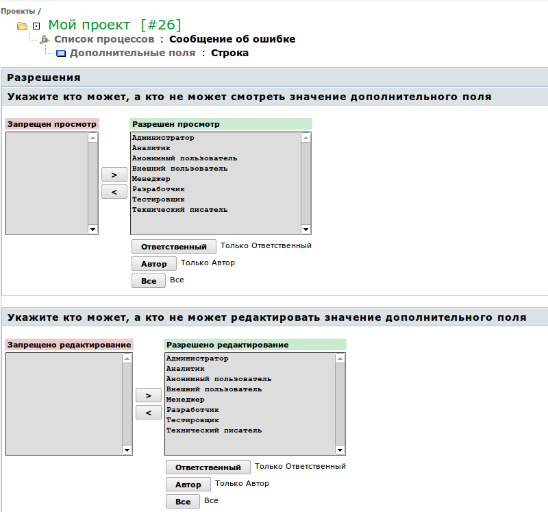 Для того, чтобы указать, кто из пользователей может видеть это дополнительное поле и кто - редактировать его, нажмите на кнопку "Разрешения". Настройки каждого из правил представлены в виде пар списков ролей. Пользователи с ролями из левого списка не могут выполнять определенные действия, пользователи из правого — могут.