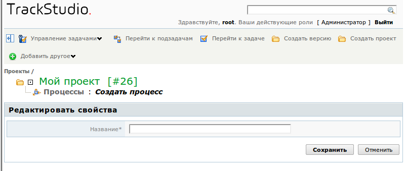 Для того, чтобы создать новый процесс, перейдите к управлению задачами. Затем перейдите на тот уровень иерархии задач, на котором вы хотите определить процесс. Задачи с этой процессом можно будет создавать только ниже по иерархии. Можно создавать все процессы на уровне корневой задачи, а привязывать к конкретным узлам иерархии через категории.
