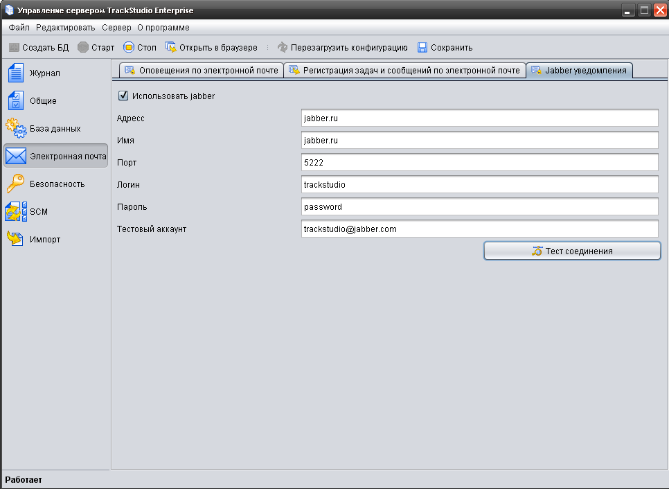 Пользователи версии Standalone могут настраивать параметры соединения с Jabber-сервером на вкладке jabber-уведомления в Server Manager.